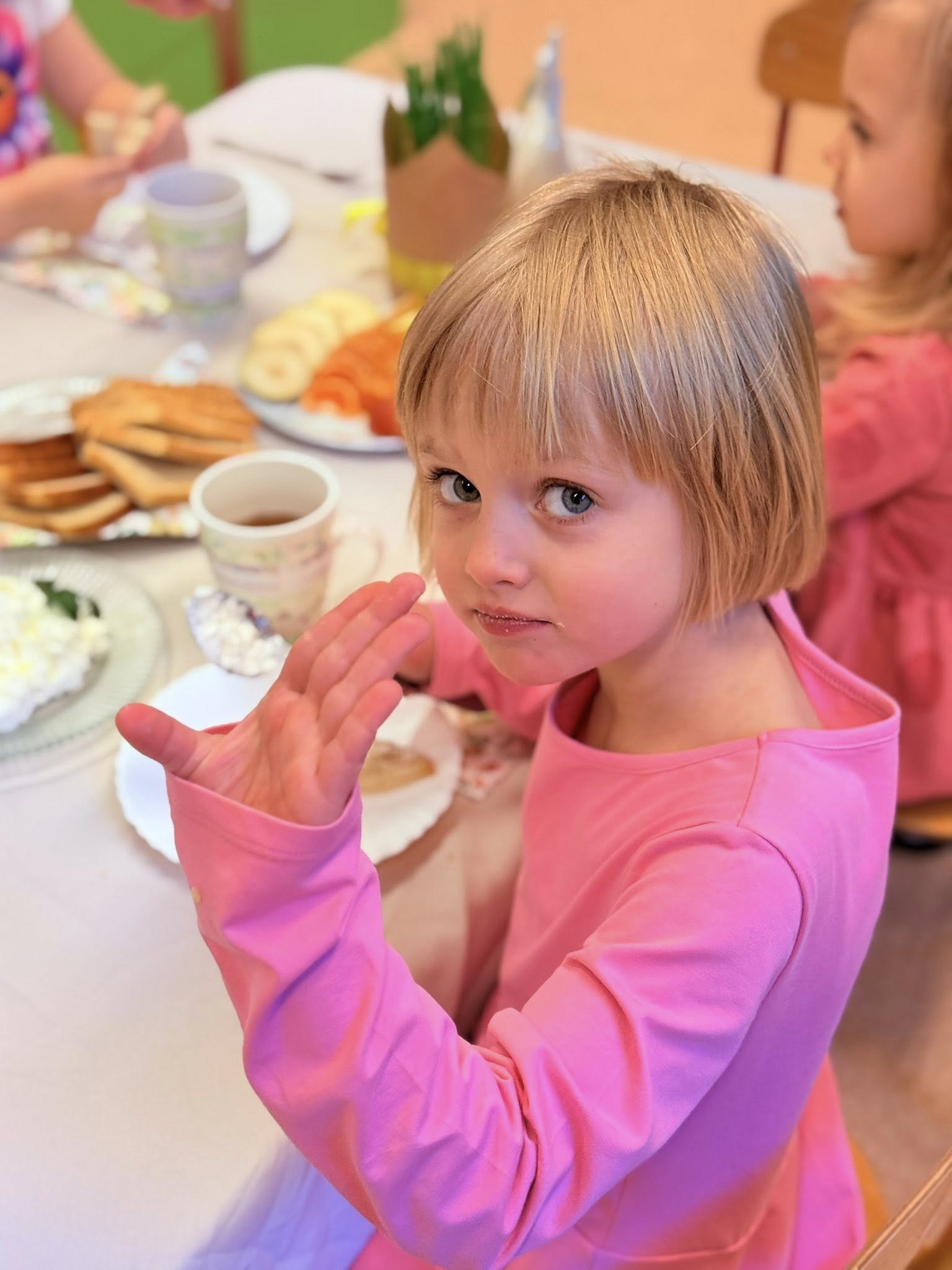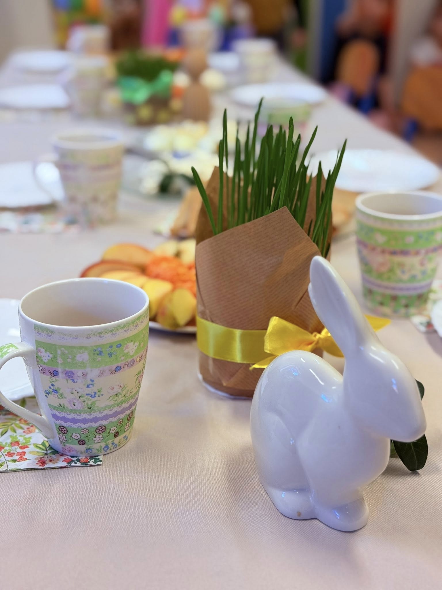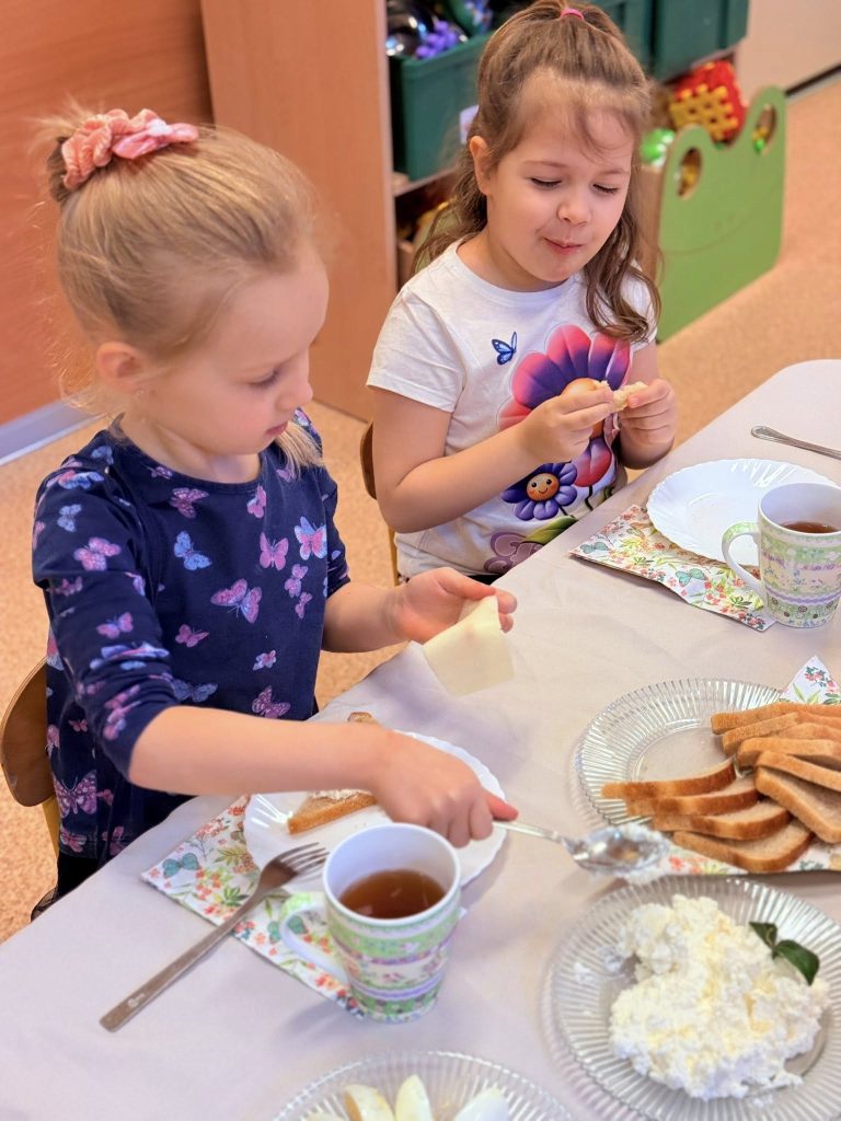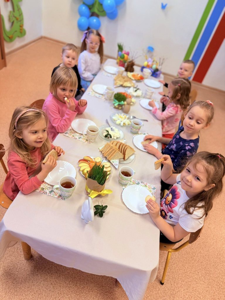 Tego dnia panowała niezwykle miła i ciepła atmosfera. Dzieci wspólnie zasiadły do pięknie udekorowanych stołów, na których nie zabrakło tradycyjnych wielkanocnych potraw. 🧺🌼 Był to nie tylko moment wspólnego posiłku, ale także okazja do rozmów o zwyczajach i symbolice Świąt Wielkanocnych. Przedszkolaki z zainteresowaniem poznawały znaczenie pisanek, baranka czy święconki. 🐑🥚